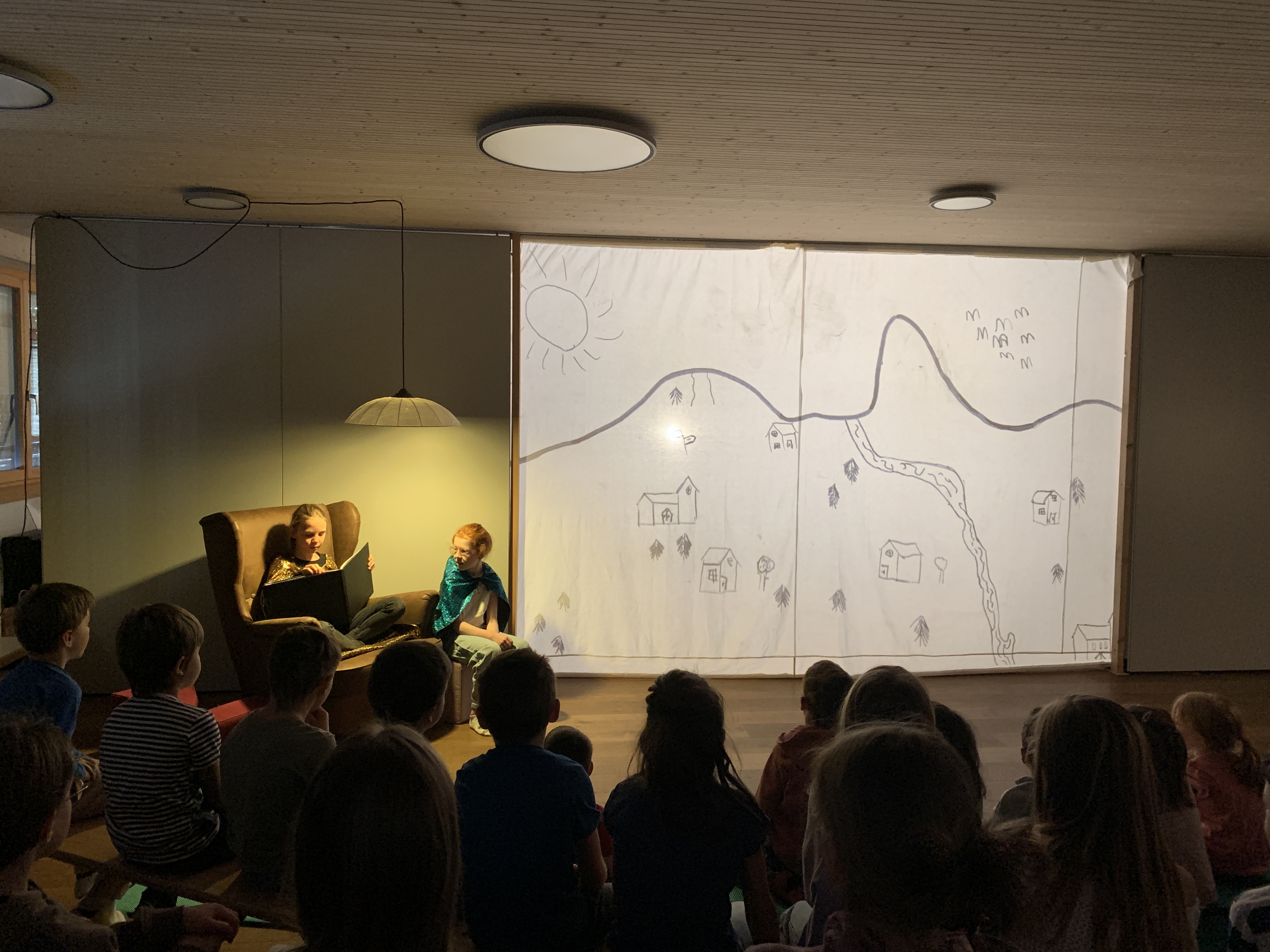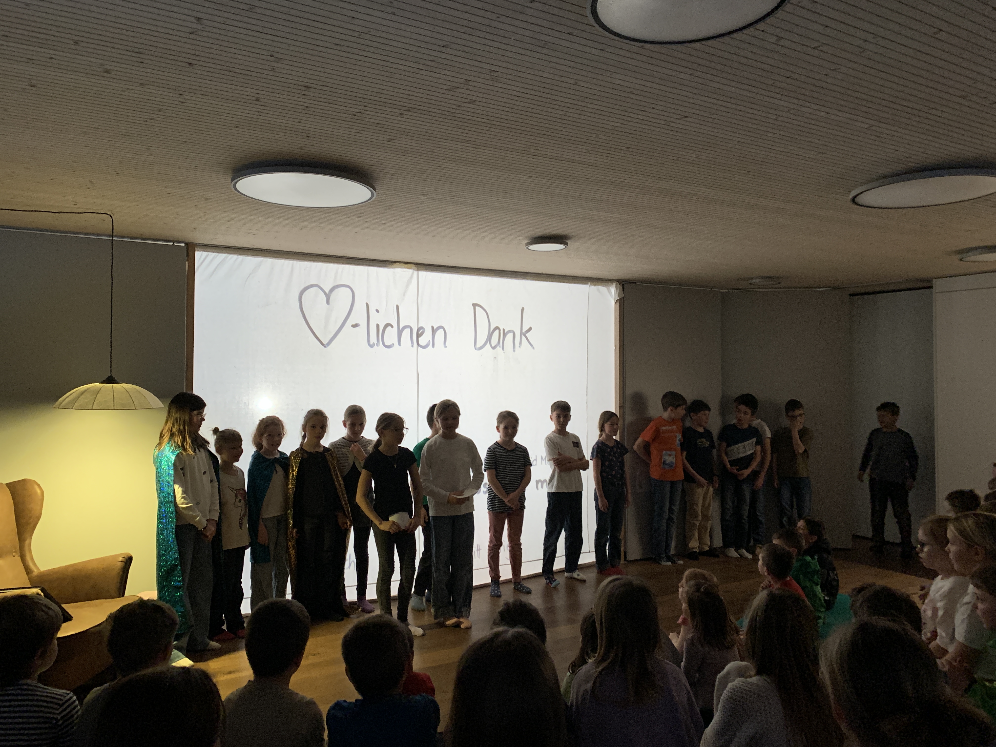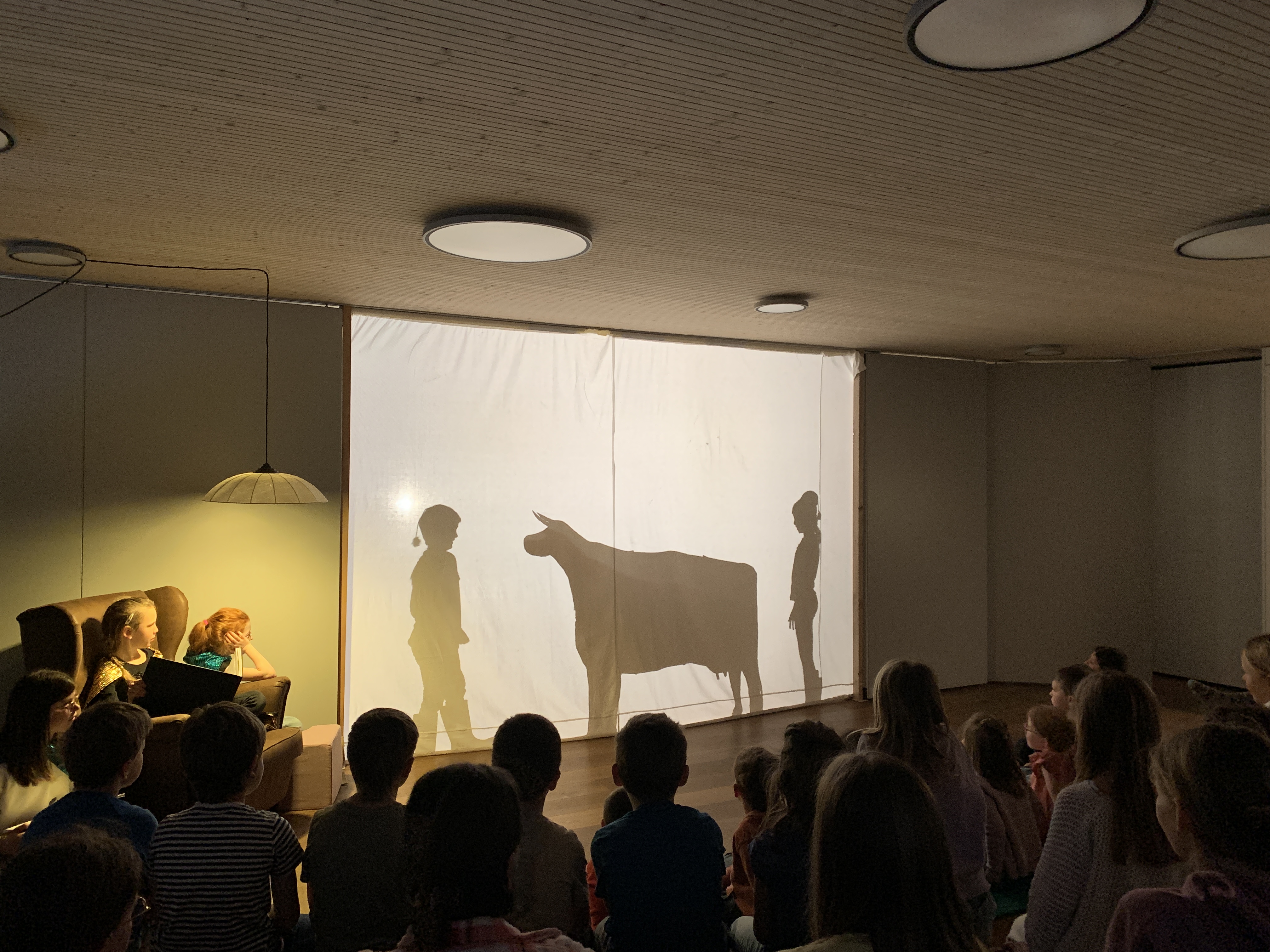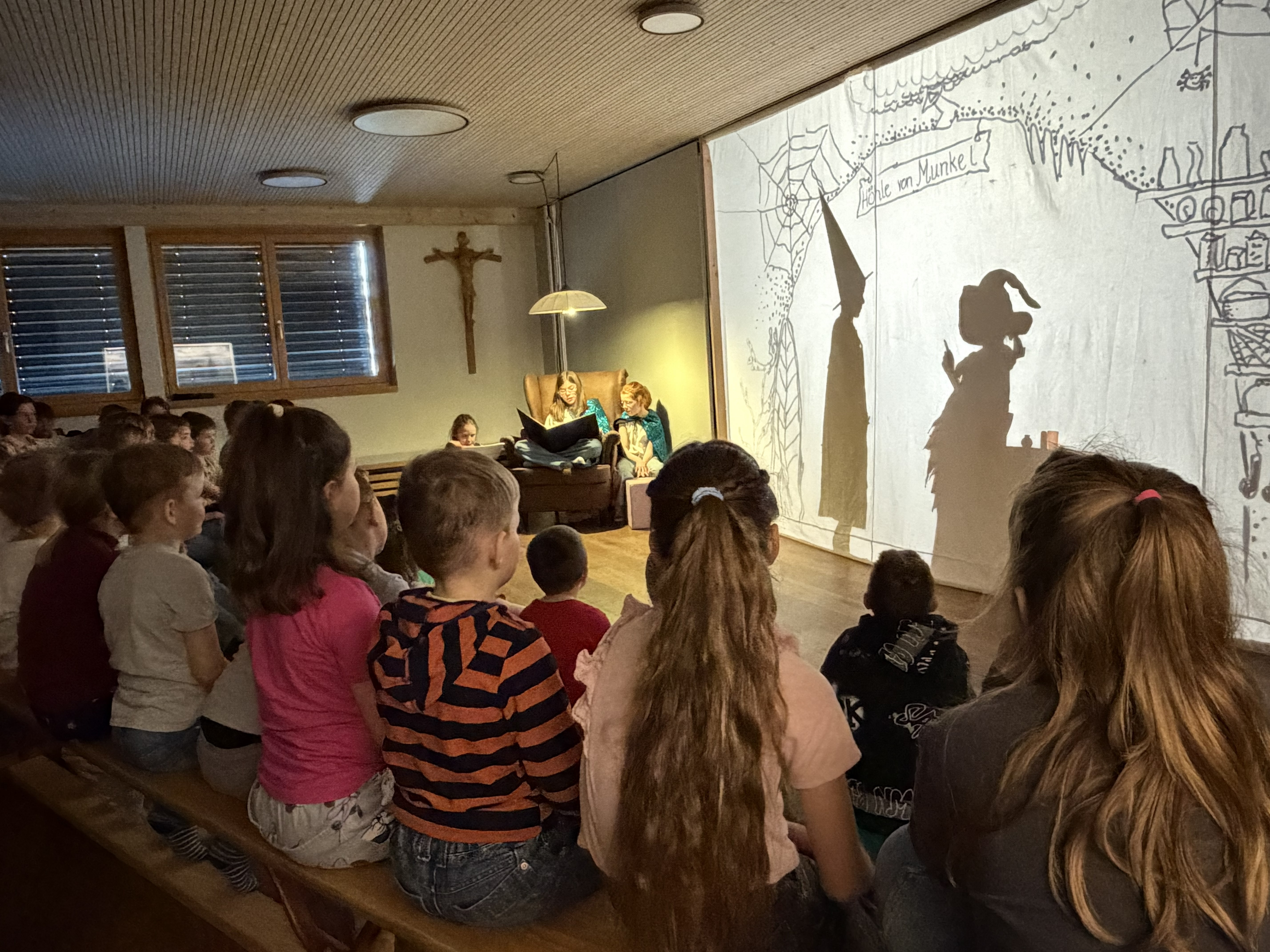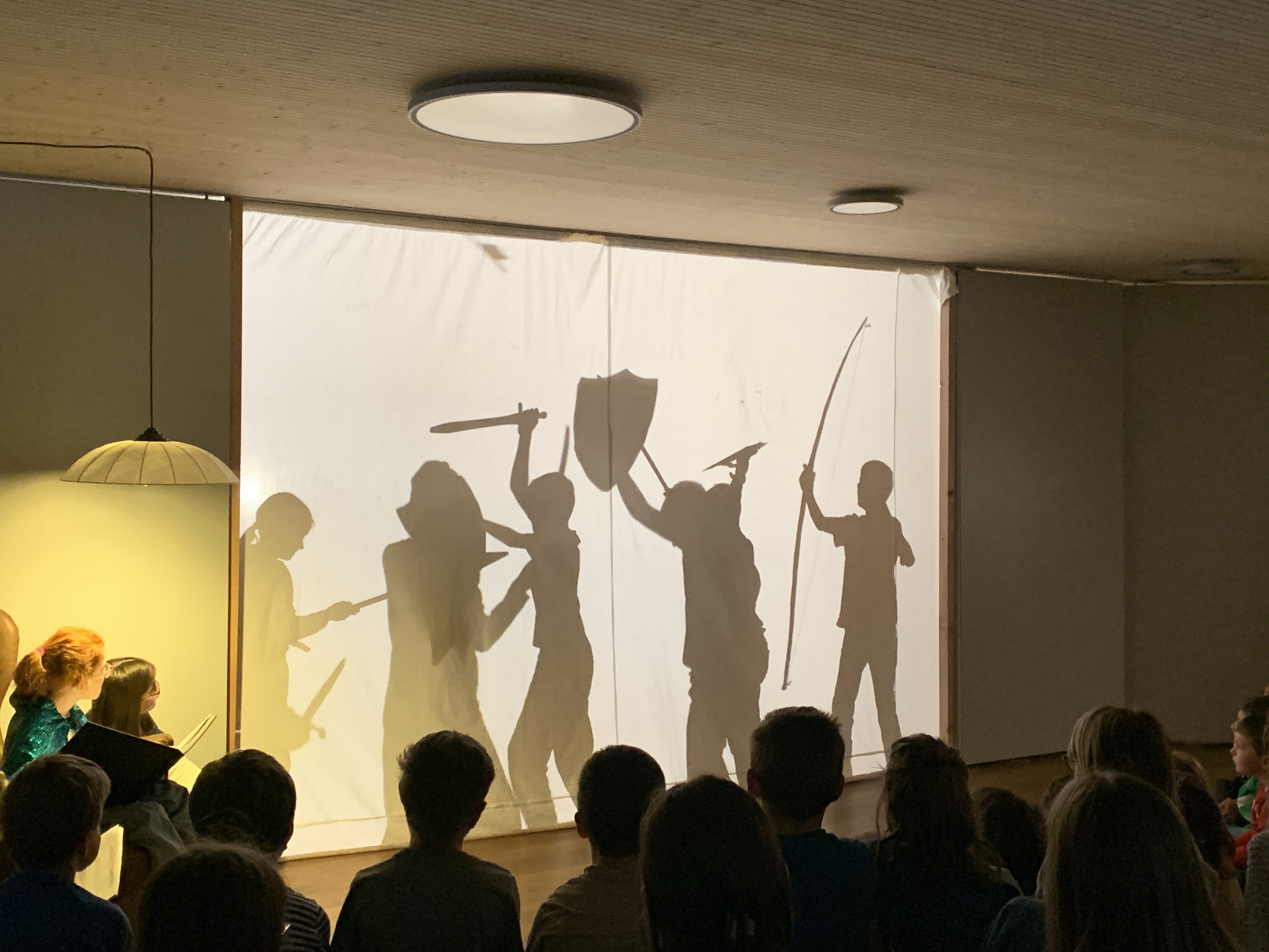 Die 4. Klasse hat als Projekt ein tolles Schattentheater erarbeitet. Der Rahmen war gesetzt. Die Geschichte nach David Mc Kee handelt von einem Zauberer, der seine Zauberkraft verloren hatte. Die Kinder erfanden Kulissen, Musik, Szenen und Charaktere. Mit viel Improvisation und guter Zusammenarbeit mündete jede Vorstellung in einem Happy End.